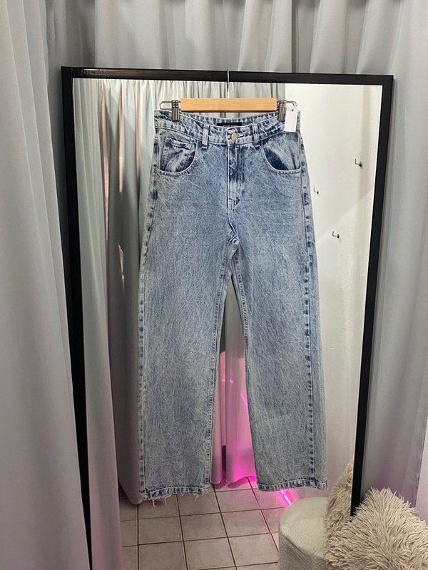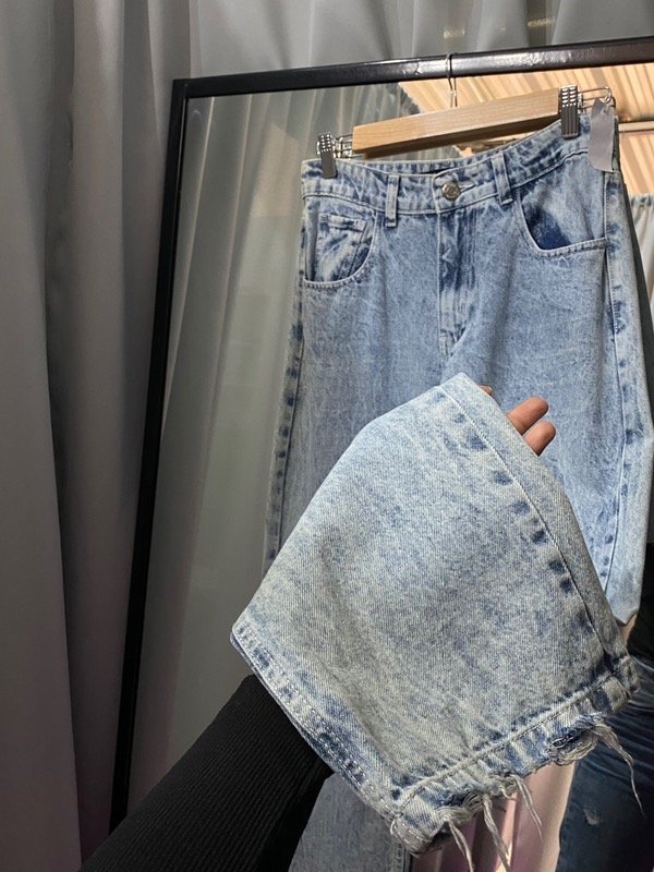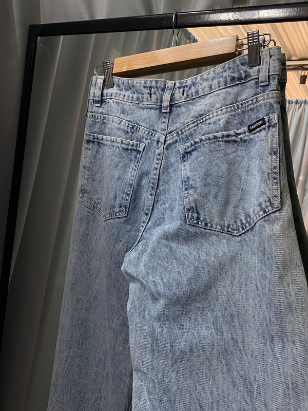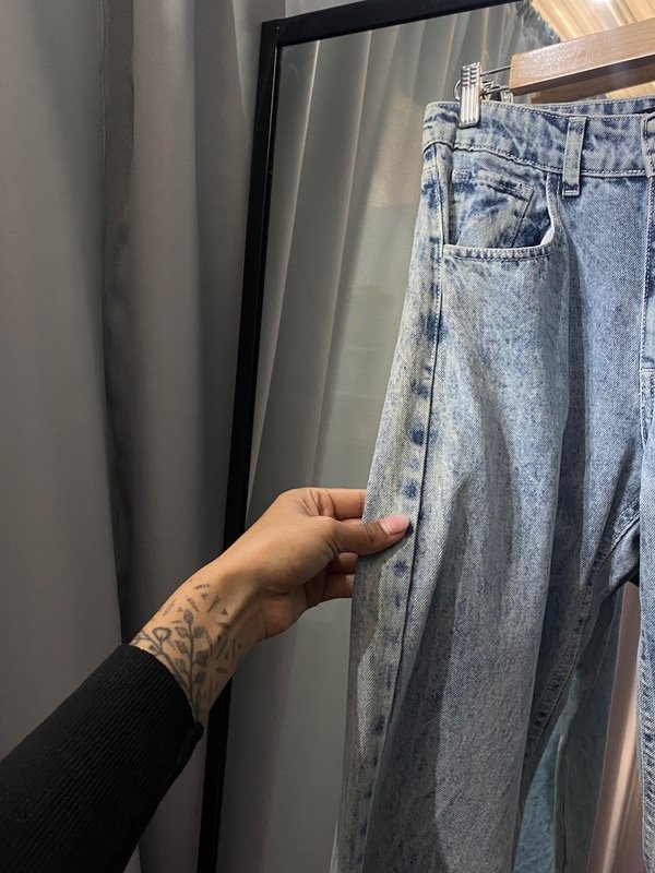 El estilo es WIDE LEG, el tono es jaspeado, y cuenta con una pequeña falla que sería la franja que muestro en una de las fotos