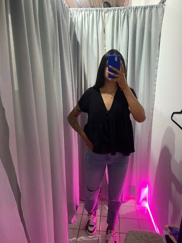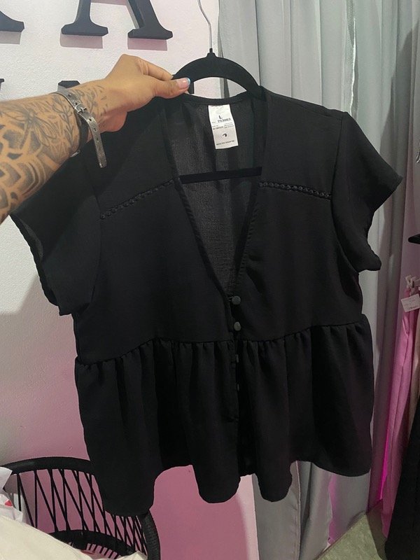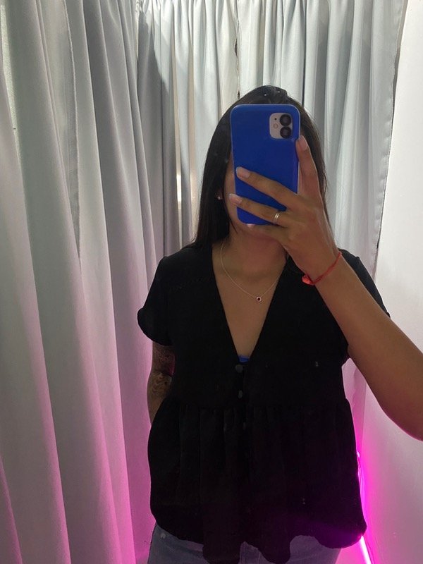 Es una blusa negra con botones delanteros, acentúa el busto y tiene una caída genial