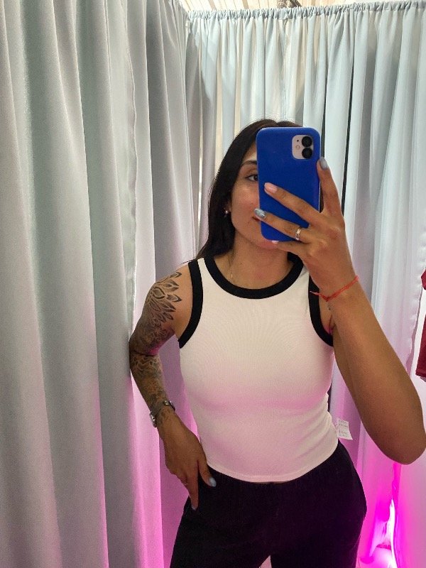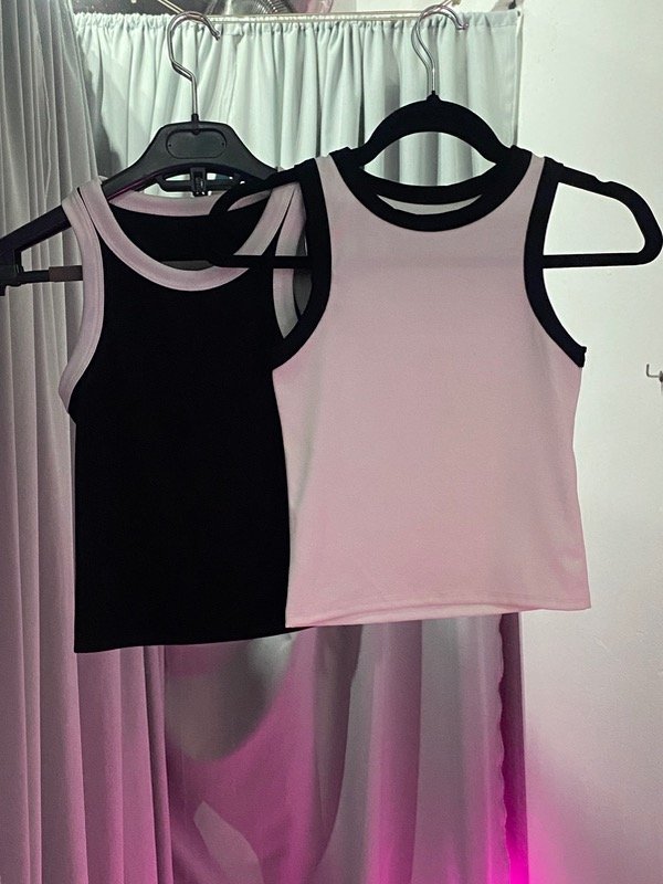 Musculosa combinada, es decir, la parte del torso tiene un color que puede ser negro o blanco y sus tiras que contornean las axilas y el cuello son en contraste. La tela es un Morley súper pesado lo que genera es una máxima comodidad.