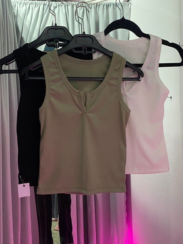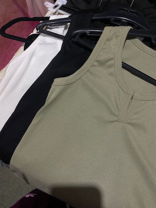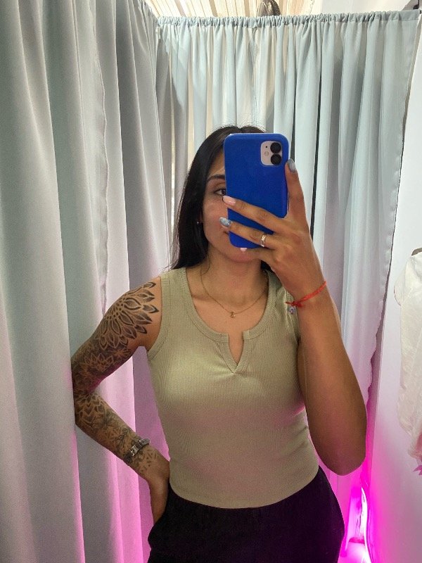 la musculosa V cuenta con un escote delantero, muy delicado. La tela es de Morley pero es bastante rígida, lo que iría para un talle S cómodamente.