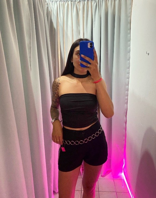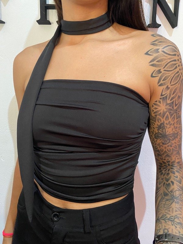 Strapless con frunce a los lados, incluye una tira la cual se puede utilizar como accesorio tipo corbatin. La tela es de lycra, no se transparenta y unico color disponible negro.