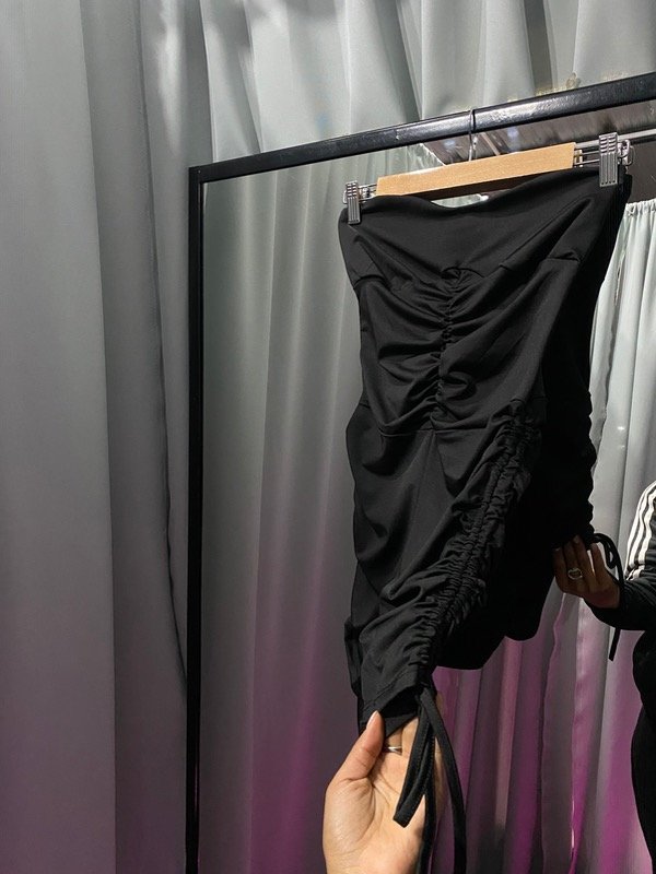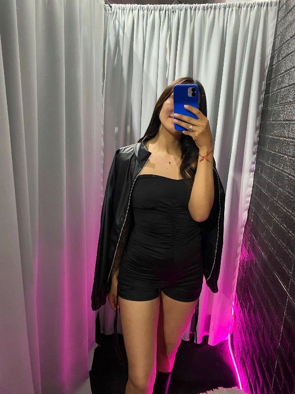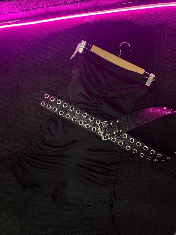 Catsuit tela lycra negra. Cuenta con frunce tanto adelante como en la parte de abajo del short y el busto marcado.